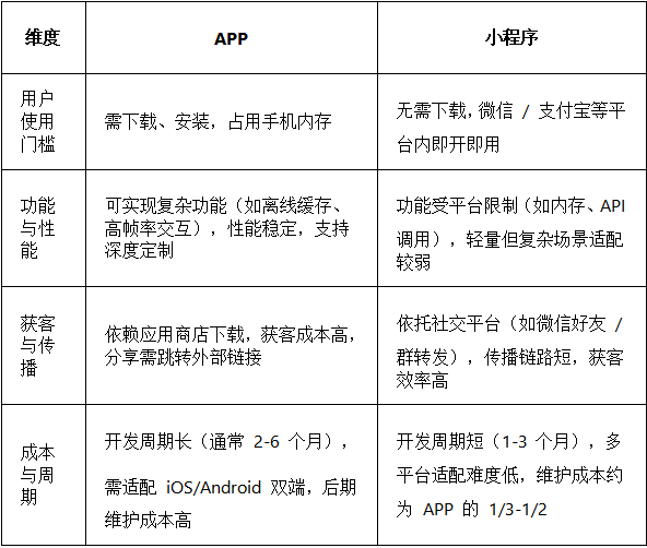 在軟件開發(fā)領(lǐng)域,APP 與小程序是企業(yè)觸達(dá)用戶的兩大核心載體。二者并無絕對(duì) “優(yōu)劣”,選擇需緊扣業(yè)務(wù)需求、用戶場(chǎng)景與成本預(yù)算,以下從核心維度拆解關(guān)鍵差異,助企業(yè)快速?zèng)Q策: